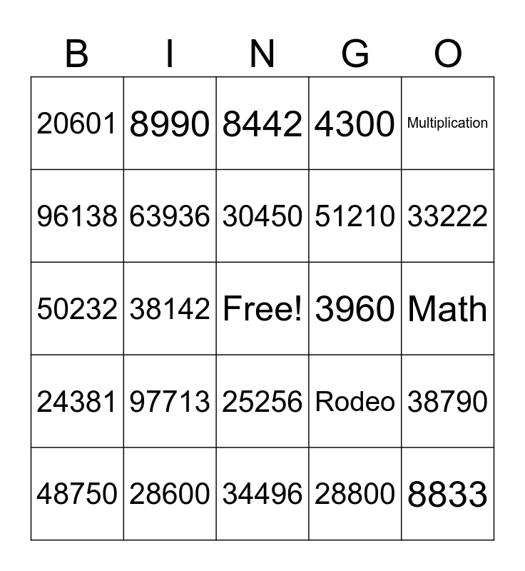 This bingo card has a free space and 28 words: 38790, 4290, 51210, 28800, 96138, 8442, 8990, 24381, 3960, 48750, 50232, 4300, 28600, 34496, 33222, 12177, 97713, 63936, 30450, 25256, 20601, 43200, 8833, 38142, Math, Rodeo, Multiplication and Rounding.