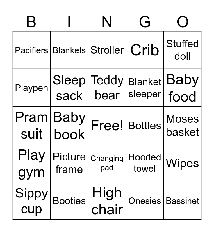 This bingo card has a free space and 37 words: Memory journal, Baby walker, Bouncy seat, Sleep sack, Wipes, Picture frame, Teddy bear, Rubber duck, Stuffed doll, Alphabet blocks, Baby book, Crib, Bassinet, Moses basket, Playpen, Play gym, Toy box, Stroller, Changing pad, Bottles, Pacifiers, Baby food, Sippy cup, High chair, Bath, Onesies, Blankets, Bibs, Baby hat, Baby socks, Mittens, Booties, Pram suit, Socks, Hooded towel, Blanket sleeper and Burp cloths.