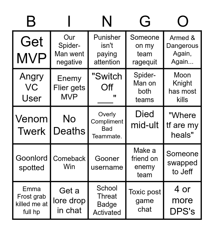 This bingo card has a free space and 24 words: Emma Frost grab killed me at full hp, Comeback Win, "Switch Off ___", Toxic post game chat, Armed & Dangerous Again, Again..., Get MVP, Our Spider-Man went negative, Punisher isn't paying attention, Died mid-ult, "Where tf are my heals", Venom Twerk, Enemy Flier gets MVP, Make a friend on enemy team, Someone swapped to Jeff, Angry VC User, Get a lore drop in chat, School Threat Badge Activated, Someone on my team ragequit, Moon Knight has most kills, Goonlord spotted, No Deaths, Gooner username, Spider-Man on both teams and 4 or more DPS's.
