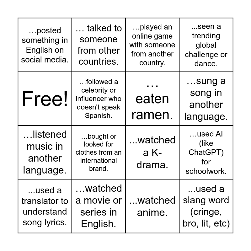 This bingo card has 16 words: …watched a movie or series in English., …used AI (like ChatGPT) for schoolwork., …played an online game with someone from another country., …posted something in English on social media., …listened music in another language., … talked to someone from other countries., ...watched a K-drama., ...watched anime., Free!, …followed a celebrity or influencer who doesn't speak Spanish., ...used a translator to understand song lyrics., ...seen a trending global challenge or dance., …bought or looked for clothes from an international brand., …sung a song in another language., …eaten ramen. and ...used a slang word (cringe, bro, lit, etc).