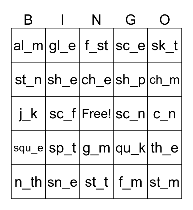 This bingo card has a free space and 24 words: sp_t, sn_e, ch_e, n_th, sk_t, al_m, st_n, gl_e, sc_n, g_m, sh_p, j_k, qu_k, th_e, sh_e, f_m, c_n, f_st, ch_m, sc_f, st_m, squ_e, sc_e and st_t.
