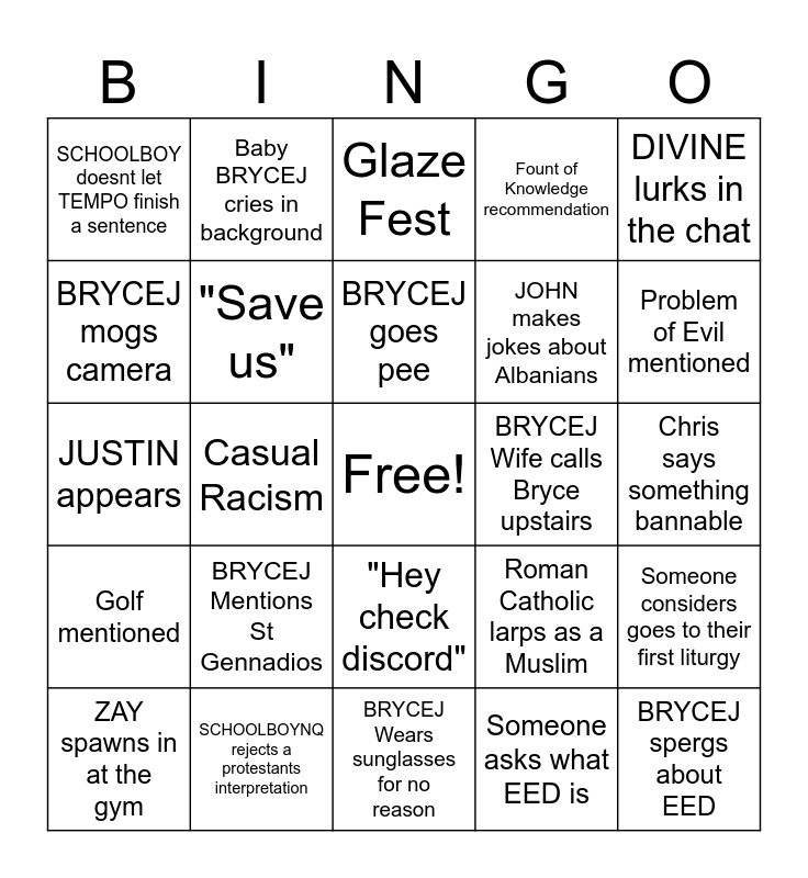 This bingo card has a free space and 24 words: BRYCEJ Mentions St Gennadios, SCHOOLBOYNQ rejects a protestants interpretation, BRYCEJ goes pee, ZAY spawns in at the gym, DIVINE lurks in the chat, SCHOOLBOY doesnt let TEMPO finish a sentence, BRYCEJ mogs camera, Baby BRYCEJ cries in background, BRYCEJ Wife calls Bryce upstairs, "Hey check discord", JOHN makes jokes about Albanians, JUSTIN appears, Roman Catholic larps as a Muslim, Someone considers goes to their first liturgy, "Save us", Someone asks what EED is, Chris says something bannable, Glaze Fest, Problem of Evil mentioned, Casual Racism, BRYCEJ spergs about EED, Golf mentioned, Fount of Knowledge recommendation and BRYCEJ Wears sunglasses for no reason.