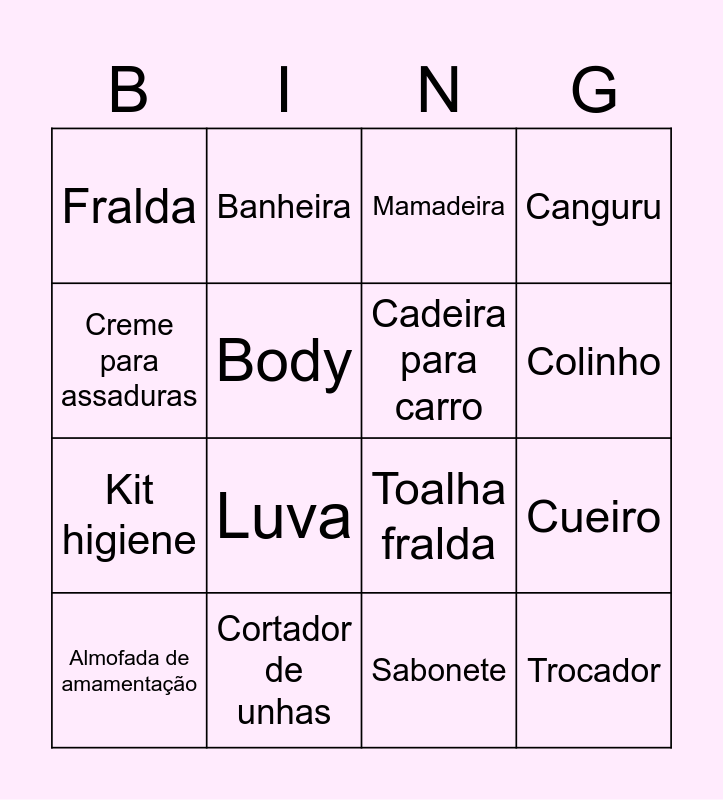 This bingo card has 50 words: Free!, Almofada de amamentação, Andador, Aspirador nasal, Babador, Babá eletrônica, Banheira, Berço, Body, Bolsa maternidade, Cadeira para carro, Canguru, Carrinho de bebê, Chupeta, Cobertor, Colher de silicone, Colinho, Cortador de unhas, Cotonete, Creme para assaduras, Cueiro, Escova de cabelo, Fralda, Kit higiene, Lenço umedecido, Lençol, Luva, Macacão, Mamadeira, Manta, Meia, Mordedor, Mosquiteiro, Naninha, Paninho de boca, Pente, Pijama, Protetor de berço, Roupinhas, Sabonete, Sapatinho, Shampoo, Sling, Tapete de atividades, Termômetro, Toalha fralda, Touca, Travesseiro, Trocador and Álcool 70.