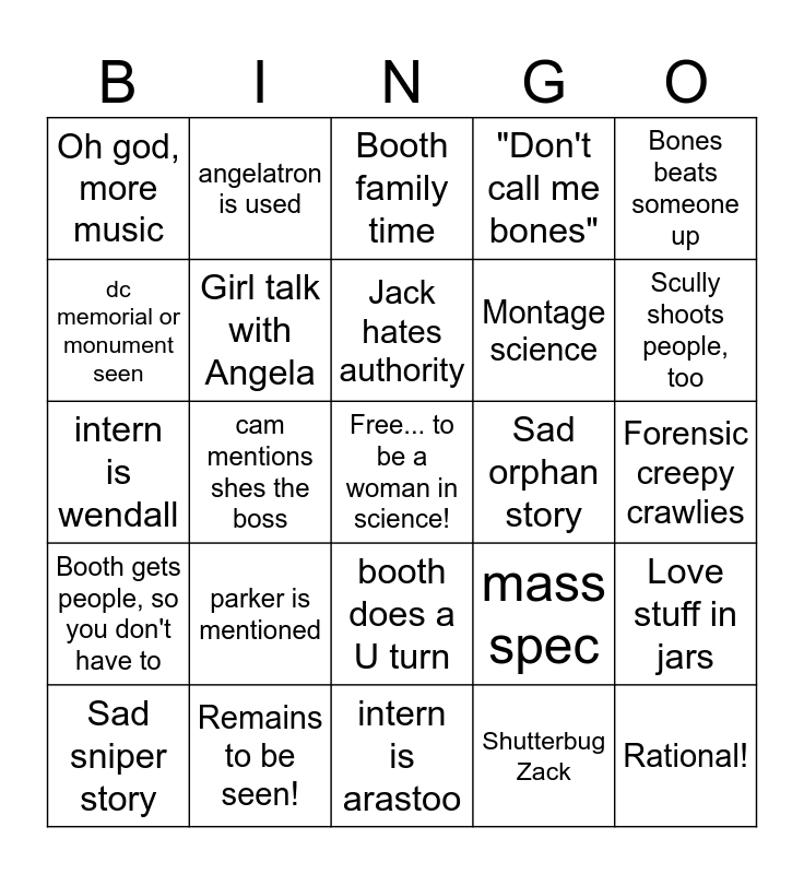 This bingo card has a free space and 58 words: Angela art thing, Remains to be seen!, Belt buckle, Booth gets people, so you don't have to, Shutterbug Zack, Zack teaching moment, Girl talk with Angela, Dr. Goodman / Camille Saroyan, Montage science, "I don't know what that means", "Don't call me bones", 3D victim magic!, Smooches, Blow something up, "With all due respect", Oh god, more music, Rational!, Bones beats someone up, Jack likes conspiracies, Jack hates authority, Sad orphan story, Booth family time, Sad sniper story, Love stuff in jars, Cultural knowledge!, Forensic creepy crawlies, Field trip out of DC, Meal time chats, Scully shoots people, too, "squint", Angela's tender heart, Interrogation room, Meet the family! (of the victim), With a little help from our FBI friends, time of death, itern is abernathy, sweets say in my professional opinion, cam mentions shes the boss, intern is wendall, an experiment is done, parker is mentioned, particulates mentioned with dr hodgins, mass spec, speak to my lawyer or i wont speak without my lawyer, hodgins and angela kiss/have coitus at work, squints, striations, booth does a U turn, intern is arastoo, I'll tell booth, eating at diner, sweets uses a word like dude, totally, intern is clark, remodeling, angelatron is used, intern is daisy, dc memorial or monument seen and i don't know what happened is said while confessing.