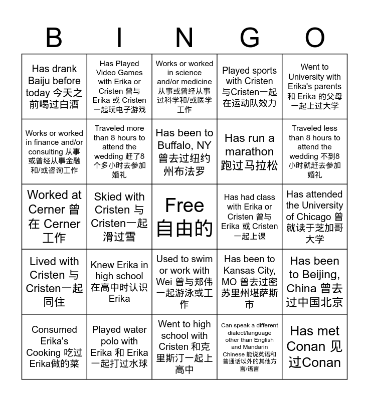 This bingo card has a free space and 24 words: Knew Erika in high school 在高中时认识 Erika, Played water polo with Erika 和 Erika 一起打过水球, Has been to Buffalo, NY 曾去过纽约州布法罗, Consumed Erika's Cooking 吃过Erika做的菜, Went to University with Erika's parents 和 Erika 的父母一起上过大学, Has drank Baiju before today 今天之前喝过白酒, Works or worked in finance and/or consulting 从事或曾经从事金融和/或咨询工作, Has Played Video Games with Erika or Cristen 曾与 Erika 或 Cristen 一起玩电子游戏, Has had class with Erika or Cristen 曾与 Erika 或 Cristen 一起上课, Used to swim or work with Wei 曾与郑伟一起游泳或工作, Has run a marathon 跑过马拉松, Worked at Cerner 曾在 Cerner 工作, Has been to Kansas City, MO 曾去过密苏里州堪萨斯市, Has been to Beijing, China 曾去过中国北京, Traveled more than 8 hours to attend the wedding 赶了8个多小时去参加婚礼, Can speak a different dialect/language other than English and Mandarin Chinese 能说英语和普通话以外的其他方言/语言, Has attended the University of Chicago 曾就读于芝加哥大学, Works or worked in science and/or medicine 从事或曾经从事过科学和/或医学工作, Traveled less than 8 hours to attend the wedding 不到8小时就赶去参加婚礼, Skied with Cristen 与Cristen一起滑过雪, Has met Conan 见过Conan, Lived with Cristen 与Cristen一起同住, Played sports with Cristen 与Cristen一起在运动队效力 and Went to high school with Cristen 和克里斯汀一起上高中.