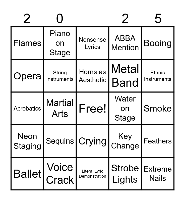 This bingo card has a free space and 24 words: Sequins, Voice Crack, Horns as Aesthetic, Ballet, Booing, Flames, Opera, Piano on Stage, Water on Stage, Crying, Metal Band, Acrobatics, Key Change, Feathers, String Instruments, Strobe Lights, Smoke, Nonsense Lyrics, Ethnic Instruments, Martial Arts, Extreme Nails, Neon Staging, ABBA Mention and Literal Lyric Demonstration.