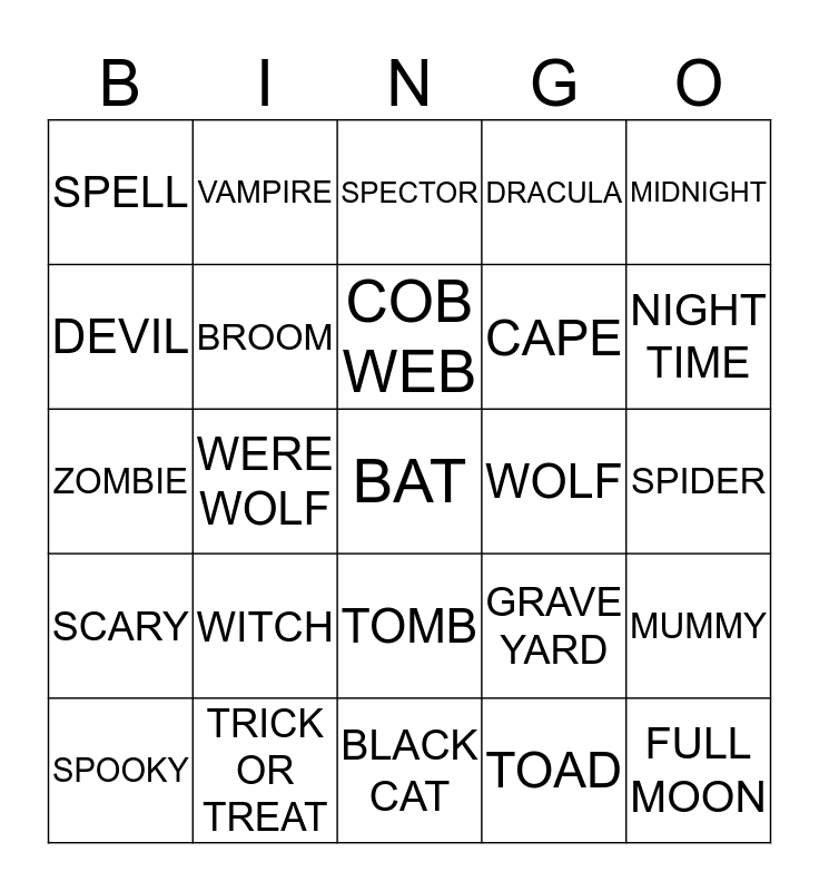 This bingo card has 25 words: WITCH, BLACK CAT, COB WEB, SPOOKY, MIDNIGHT, SPELL, DEVIL, VAMPIRE, WOLF, TOMB, CAPE, ZOMBIE, GRAVE YARD, MUMMY, BROOM, FULL MOON, SPIDER, SPECTOR, NIGHT TIME, WERE WOLF, BAT, TRICK OR TREAT, SCARY, DRACULA and TOAD.