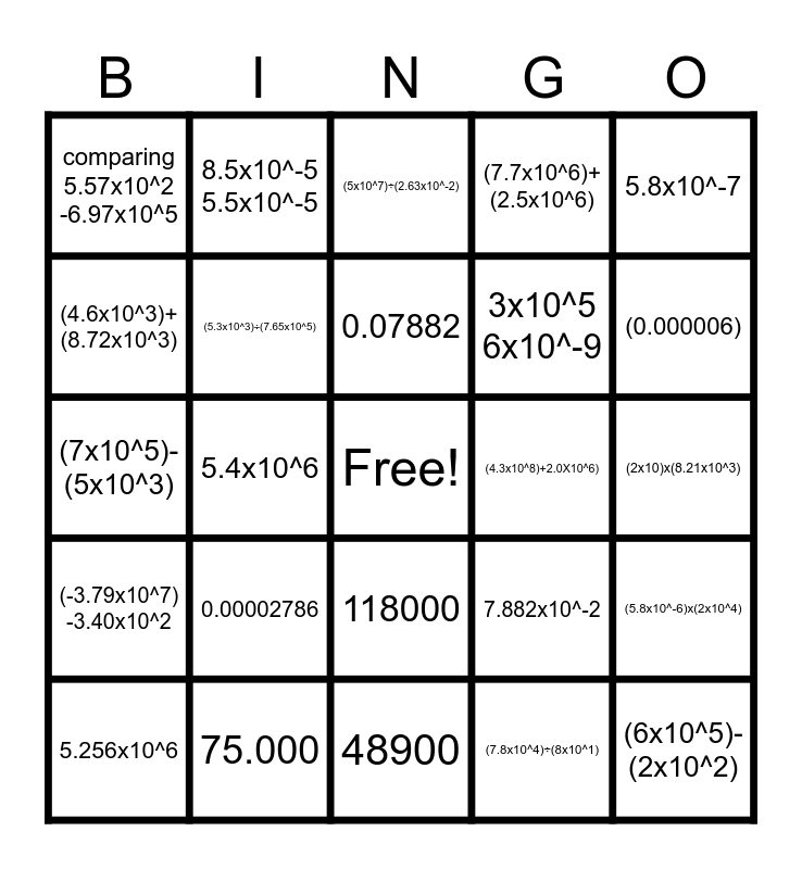 This bingo card has a free space and 24 words: 0.00002786, 75.000, 0.07882, 5.256x10^6, 5.8x10^-7, comparing 5.57x10^2 -6.97x10^5, (4.6x10^3)+(8.72x10^3), 8.5x10^-5 5.5x10^-5, (4.3x10^8)+2.0X10^6), 118000, 3x10^5 6x10^-9, (7x10^5)-(5x10^3), 7.882x10^-2, (5.8x10^-6)x(2x10^4), (5.3x10^3)÷(7.65x10^5), (7.8x10^4)÷(8x10^1), (2x10)x(8.21x10^3), (5x10^7)÷(2.63x10^-2), (0.000006), 5.4x10^6, (6x10^5)-(2x10^2), (-3.79x10^7) -3.40x10^2, (7.7x10^6)+(2.5x10^6) and 48900.