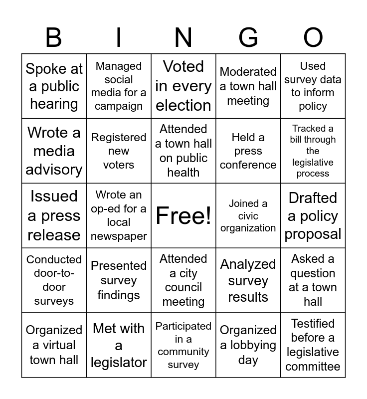 This bingo card has a free space and 30 words: Met with a legislator, Participated in a protest, Wrote an op-ed for a local newspaper, Created an advocacy campaign, Spoke at a public hearing, Voted in every election, Registered new voters, Attended a city council meeting, Joined a civic organization, Participated in a community survey, Drafted a policy proposal, Testified before a legislative committee, Organized a lobbying day, Met with a government official, Tracked a bill through the legislative process, Designed a community survey, Analyzed survey results, Conducted door-to-door surveys, Presented survey findings, Used survey data to inform policy, Issued a press release, Appeared on local TV/radio, Managed social media for a campaign, Held a press conference, Wrote a media advisory, Moderated a town hall meeting, Asked a question at a town hall, Organized a virtual town hall, Attended a town hall on public health and Participated in a town hall discussion.
