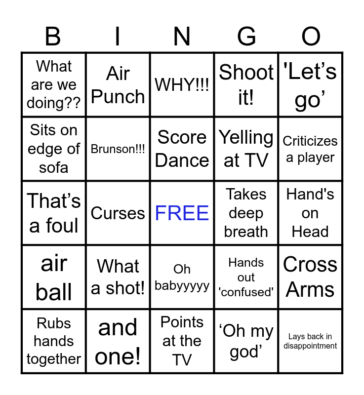 This bingo card has a free space and 24 words: What a shot!, and one!, Score Dance, Rubs hands together, 'Let’s go’, What are we doing??, Sits on edge of sofa, Air Punch, Takes deep breath, Oh babyyyyy, Yelling at TV, That’s a foul, Hands out 'confused', Cross Arms, Brunson!!!, ‘Oh my god’, Hand's on Head, WHY!!!, Criticizes a player, Curses, Lays back in disappointment, air ball, Shoot it! and Points at the TV.