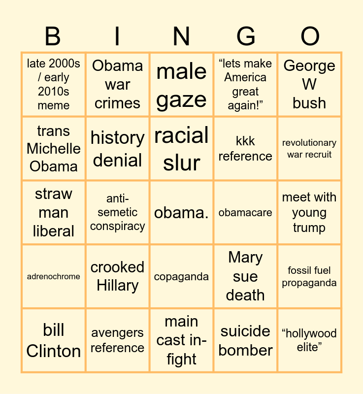 This bingo card has a free space and 24 words: crooked Hillary, avengers reference, racial slur, bill Clinton, George W bush, late 2000s / early 2010s meme, trans Michelle Obama, Obama war crimes, obamacare, copaganda, kkk reference, straw man liberal, Mary sue death, fossil fuel propaganda, history denial, suicide bomber, meet with young trump, male gaze, revolutionary war recruit, anti-semetic conspiracy, “hollywood elite”, adrenochrome, “lets make America great again!” and main cast in-fight.