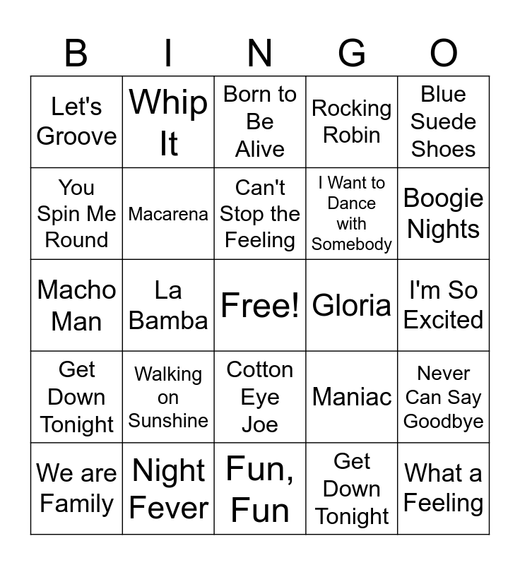 This bingo card has a free space and 39 words: YMCA, Loco-Motion, Staying Alive, Macarena, We are Family, Cotton Eye Joe, Can't Stop the Feeling, How deep is Your Love, Blue Suede Shoes, Get Down Tonight, La Bamba, Rocking Robin, What a Feeling, I'm So Excited, Gloria, Walking on Sunshine, Celebration, Let's Groove, Everlasting Love, Maniac, You Spin Me Round, Fun, Fun, I Want to Dance with Somebody, Boogie Nights, Lovely Day, Dancing Queen, Footloose, Dancing in the Street, Walk this Way, Whip It, You and I, Disco Inferno, Born to Be Alive, Night Fever, Get Down Tonight, Ladies Night, Never Can Say Goodbye, Macho Man and Shout.