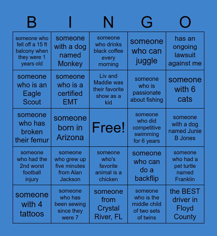 This bingo card has a free space and 24 words: someone who grew up five minutes from Alan Jackson, someone who has been sewing since they were 7, Liv and Maddie was their favorite show as a kid, someone with 4 tattoos, has an ongoing lawsuit against me, someone who fell off a 15 ft balcony when they were 1 years old, someone who is an Eagle Scout, someone with a dog named Monkey, someone who did competitive swimming for 6 years, someone who's favorite animal is a chicken, someone who is passionate about fishing, someone who has broken their femur, someone who can do a backflip, someone who had a pet turtle named Franklin, someone who is a certified EMT, someone who is the middle child of two sets of twins, someone with a dog named Junie B Jones, someone who drinks black coffee every morning, someone with 6 cats, someone born in Arizona, the BEST driver in Floyd County, someone who had the 2nd worst football injury, someone who can juggle and someone from Crystal River, FL.