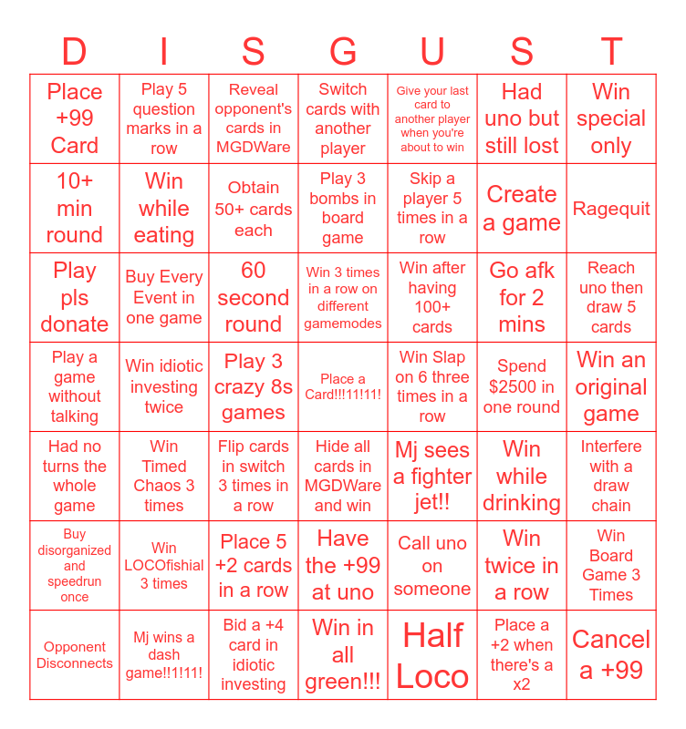 This bingo card has a free space and 48 words: Call uno on someone, Create a game, Win in all green!!!, Win idiotic investing twice, 60 second round, Win an original game, Play 5 question marks in a row, Mj wins a dash game!!1!11!, Had uno but still lost, Hide all cards in MGDWare and win, Win special only, Switch cards with another player, Go afk for 2 mins, Win after having 100+ cards, Buy disorganized and speedrun once, Spend $2500 in one round, 10+ min round, Ragequit, Win twice in a row, Give your last card to another player when you're about to win, Skip a player 5 times in a row, Play 3 crazy 8s games, Place +99 Card, Win while eating, Win Board Game 3 Times, Obtain 50+ cards each, Reach uno then draw 5 cards, Opponent Disconnects, Win 3 times in a row on different gamemodes, Buy Every Event in one game, Place a +2 when there's a x2, Win Slap on 6 three times in a row, Interfere with a draw chain, Win LOCOfishial 3 times, Play a game without talking, Mj sees a fighter jet!!, Win while drinking, Play pls donate, Flip cards in switch 3 times in a row, Place 5 +2 cards in a row, Had no turns the whole game, Cancel a +99, Reveal opponent's cards in MGDWare, Bid a +4 card in idiotic investing, Play 3 bombs in board game, Have the +99 at uno, Win Timed Chaos 3 times and Half Loco.