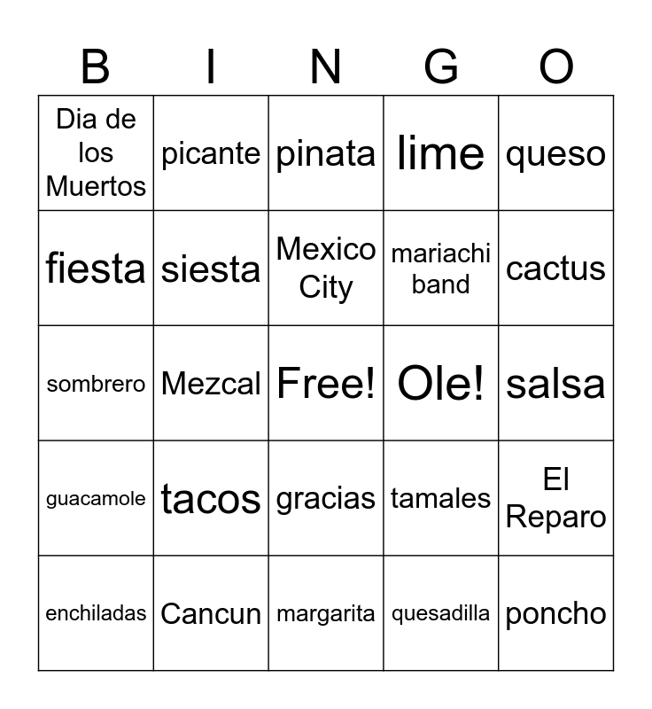 This bingo card has a free space and 24 words: tacos, Cancun, Mexico City, enchiladas, queso, Dia de los Muertos, fiesta, picante, Ole!, gracias, mariachi band, sombrero, tamales, El Reparo, siesta, quesadilla, salsa, pinata, cactus, Mezcal, poncho, guacamole, lime and margarita.