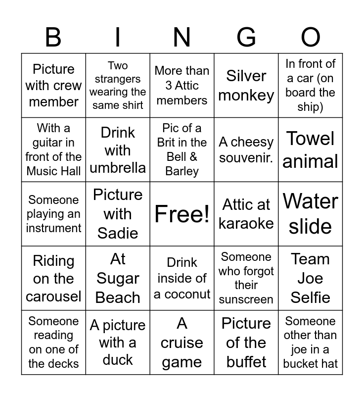 This bingo card has a free space and 30 words: A picture with a duck, Decorated door, Picture with Sadie, Picture with joe, Picture with crew member, More than 3 Attic members, Drink with umbrella, Drink inside of a coconut, Attic at karaoke, A cruise game, Water slide, Someone other than joe in a bucket hat, Picture of the buffet, Picture of a dining room, Towel animal, Someone wearing a sea sickness patch, Someone who forgot their sunscreen, Riding on the carousel, At Sugar Beach, In front of a car (on board the ship), Someone playing an instrument, Ice sculpture or animal carved out of fruit, Two strangers wearing the same shirt, A cheesy souvenir., With a guitar in front of the Music Hall, Silver monkey, Team Joe Selfie, Someone reading on one of the decks, Pic of a Brit in the Bell & Barley and Someone in a Captains hat NOT cruise employee.