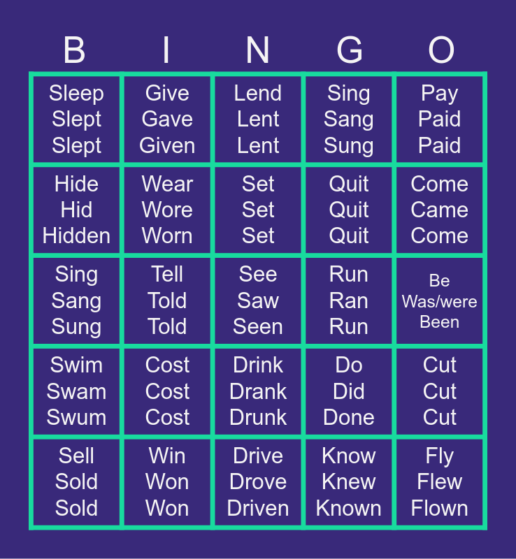This bingo card has 32 words: Know Knew Known, Find Found Found, Tell Told Told, Feel Felt Felt, Swim Swam Swum, Wear Wore Worn, Pay Paid Paid, Cut Cut Cut, Give Gave Given, Fly Flew Flown, Set Set Set, Lend Lent Lent, Shake Shook Shaken, Eat Ate Eaten, Run Ran Run, Go Went Gone, Sell Sold Sold, Sing Sang Sung, Drink Drank Drunk, Cost Cost Cost, Do Did Done, Begin Began Begun, Be Was/were Been, Win Won Won, See Saw Seen, Sing Sang Sung, Quit Quit Quit, Hide Hid Hidden, Sleep Slept Slept, Drive Drove Driven, Meet Met Met and Come Came Come.