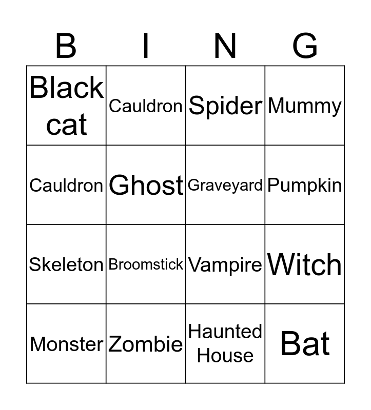 This bingo card has a free space and 15 words: Monster, Bat, Spider, Black cat, Pumpkin, Cauldron, Broomstick, Haunted House, Ghost, Skeleton, Witch, Mummy, Graveyard, Cauldron and Zombie.