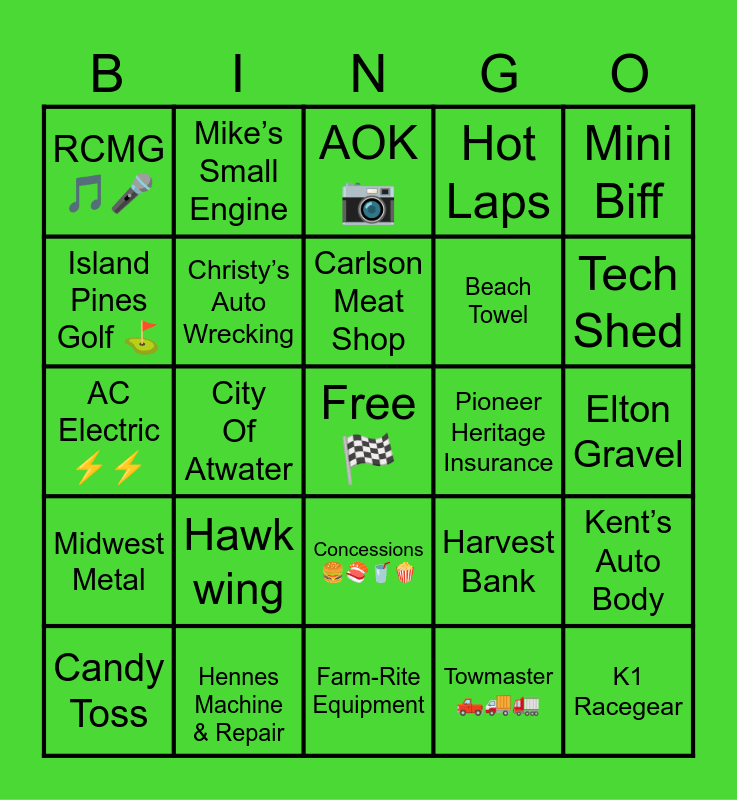 This bingo card has a free space and 24 words: Hawk wing, Hennes Machine & Repair, Carlson Meat Shop, Candy Toss, Mini Biff, RCMG 🎵🎤, Island Pines Golf ⛳️, Mike’s Small Engine, Pioneer Heritage Insurance, Concessions 🍔🍣🥤🍿, Beach Towel, AC Electric ⚡️⚡️, Harvest Bank, Kent’s Auto Body, Christy’s Auto Wrecking, Towmaster 🛻🚚🚛, Elton Gravel, AOK 📷, Tech Shed, City Of Atwater, K1 Racegear, Midwest Metal, Hot Laps and Farm-Rite Equipment.