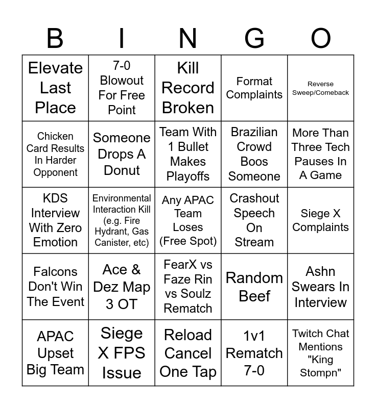 This bingo card has a free space and 24 words: APAC Upset Big Team, Ace & Dez Map 3 OT, Team With 1 Bullet Makes Playoffs, 1v1 Rematch 7-0, Reverse Sweep/Comeback, Elevate Last Place, 7-0 Blowout For Free Point, Kill Record Broken, Crashout Speech On Stream, Siege X Complaints, KDS Interview With Zero Emotion, Someone Drops A Donut, Random Beef, Ashn Swears In Interview, Chicken Card Results In Harder Opponent, Siege X FPS Issue, Reload Cancel One Tap, Format Complaints, More Than Three Tech Pauses In A Game, Falcons Don't Win The Event, Environmental Interaction Kill (e.g. Fire Hydrant, Gas Canister, etc), FearX vs Faze Rin vs Soulz Rematch, Brazilian Crowd Boos Someone and Twitch Chat Mentions "King Stompn".