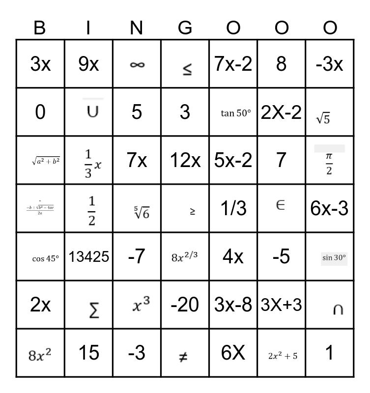 This bingo card has 22 images and 27 words: 3X+3, 2X-2, 6X, 7x, 6x-3, 9x, -3, 8, -3x, 7, 5x-2, 0, 7x-2, 3x, 5, 15, 12x, 1, 1/3, 2x, 4x, -5, -7, -20, 3, 3x-8 and 13425.