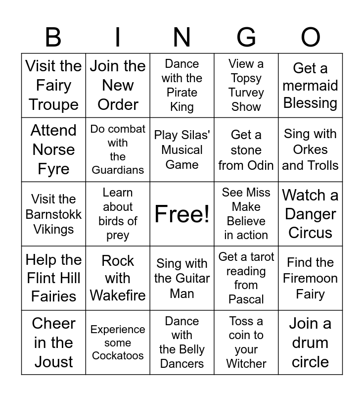 This bingo card has a free space and 24 words: Rock with Wakefire, Experience some Cockatoos, Play Silas' Musical Game, Cheer in the Joust, Get a mermaid Blessing, Visit the Fairy Troupe, Attend Norse Fyre, Join the New Order, See Miss Make Believe in action, Sing with the Guitar Man, Get a stone from Odin, Visit the Barnstokk Vikings, Get a tarot reading from Pascal, Find the Firemoon Fairy, Do combat with the Guardians, Toss a coin to your Witcher, Watch a Danger Circus, Dance with the Pirate King, Sing with Orkes and Trolls, Learn about birds of prey, Join a drum circle, Help the Flint Hill Fairies, View a Topsy Turvey Show and Dance with the Belly Dancers.