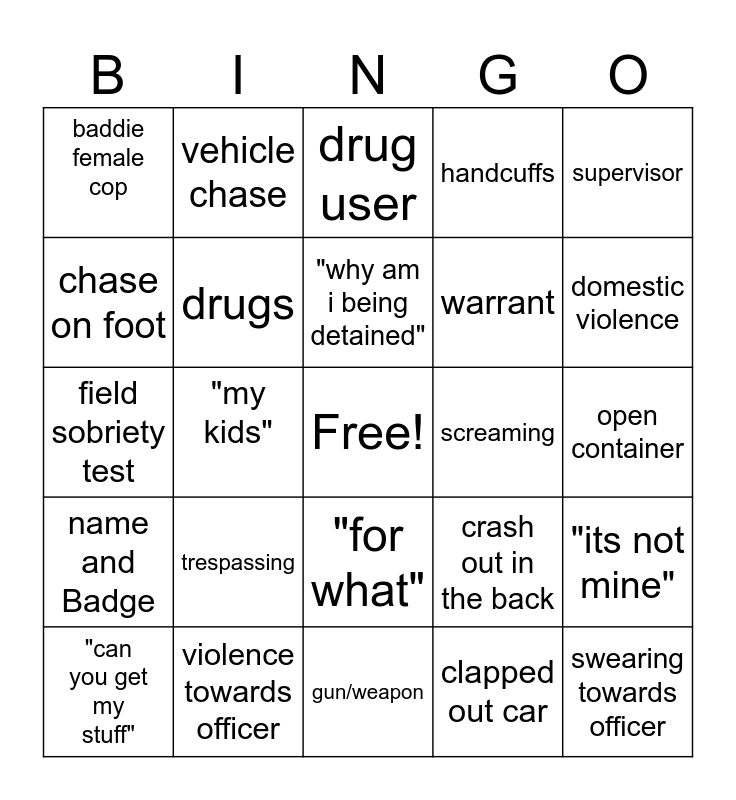 This bingo card has a free space and 29 words: "can you get my stuff", "my phone", "my kids", dui, baddie female cop, drug user, drugs, trespassing, screaming, violence towards officer, open container, swearing towards officer, gun/weapon, clapped out car, domestic violence, "i didnt do nothing", "for what", name and Badge, supervisor, field sobriety test, crash out in the back, people watching the crashout, warrant, chase on foot, handcuffs, vehicle chase, "its not mine", "why am i being detained" and shots fired.