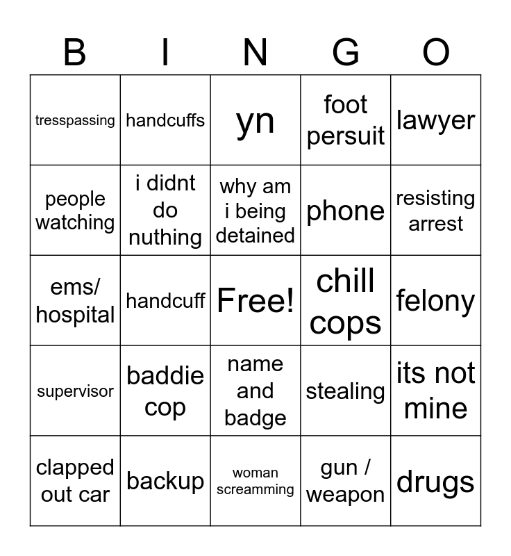 This bingo card has a free space and 29 words: clapped out car, my kids, handcuff, dui, tresspassing, yn, i didnt do nuthing, baddie cop, chill cops, backup, felony, drugs, woman screamming, gun / weapon, resisting arrest, cop car crashout, name and badge, supervisor, lawyer, ems/ hospital, stealing, white tweaker, phone, people watching, foot persuit, handcuffs, its not mine, why am i being detained and raciest.