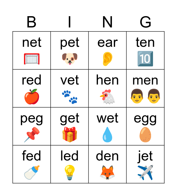This bingo card has 20 words: egg ๐ฅ, eye ๐๏ธ, ear ๐, bed ๐๏ธ, fed ๐ผ, red ๐, led ๐ก, net ๐ฅ , peg ๐, pet ๐ถ, get ๐, wet ๐ง, vet ๐พ, jet โ๏ธ, hen ๐, pen ๐๏ธ, men ๐จ๐จ, ten ๐, den ๐ฆ and leg ๐ฆต.