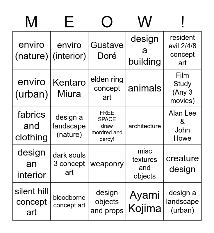 This bingo card has a free space and 24 words: dark souls 3 concept art, bloodborne concept art, elden ring concept art, silent hill concept art, resident evil 2/4/8 concept art, enviro (nature), enviro (urban), enviro (interior), architecture, weaponry, animals, fabrics and clothing, misc textures and objects, creature design, Kentaro Miura, Ayami Kojima, Alan Lee & John Howe, Gustave Doré, Film Study (Any 3 movies), design a landscape (nature), design a landscape (urban), design an interior, design a building and design objects and props.