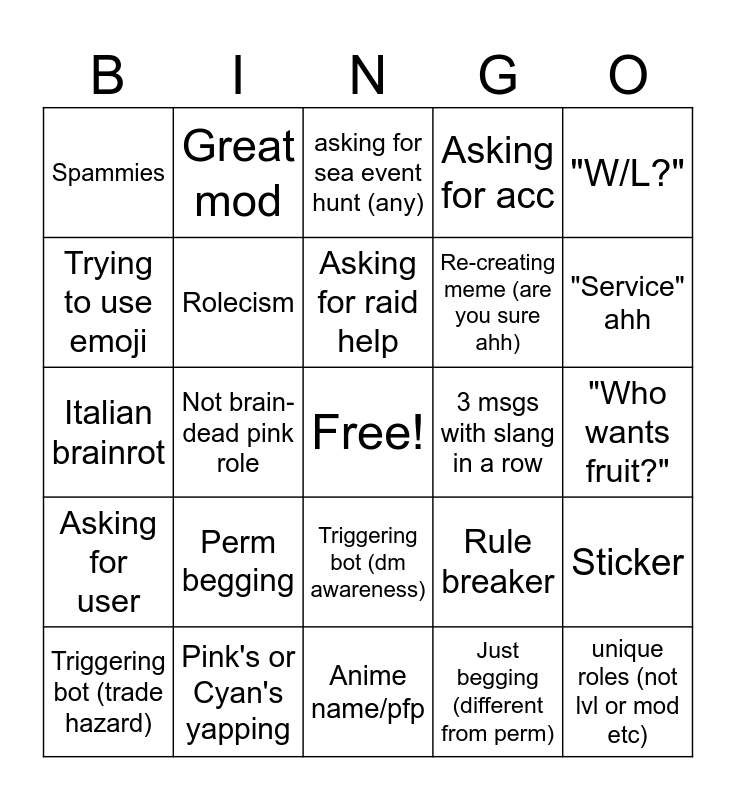 This bingo card has a free space and 24 words: Perm begging, Pink's or Cyan's yapping, Asking for raid help, Triggering bot (trade hazard), "W/L?", Spammies, Trying to use emoji, Great mod, 3 msgs with slang in a row, Triggering bot (dm awareness), Re-creating meme (are you sure ahh), Italian brainrot, Rule breaker, Sticker, Rolecism, Just begging (different from perm), "Who wants fruit?", asking for sea event hunt (any), "Service" ahh, Not brain-dead pink role, unique roles (not lvl or mod etc), Asking for user, Asking for acc and Anime name/pfp.