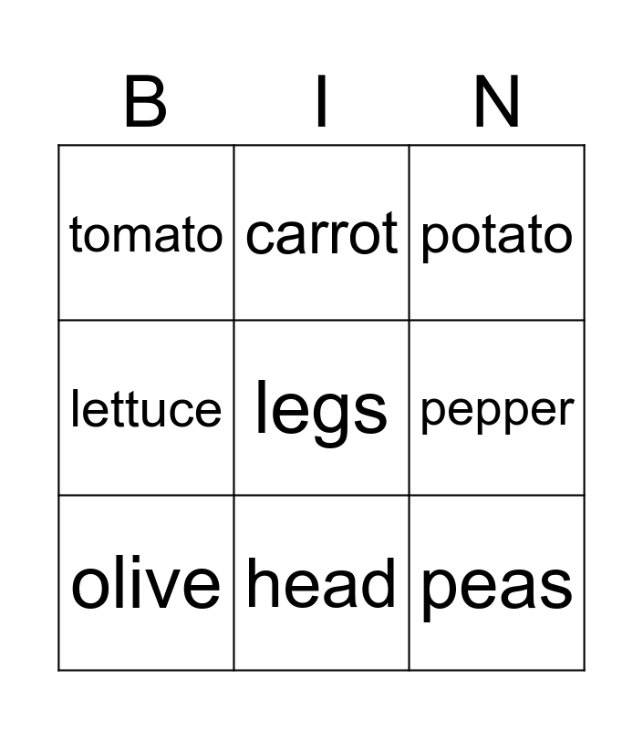 This bingo card has a free space and 8 words: pepper, potato, carrot, olive, tomato, peas, lettuce and head.