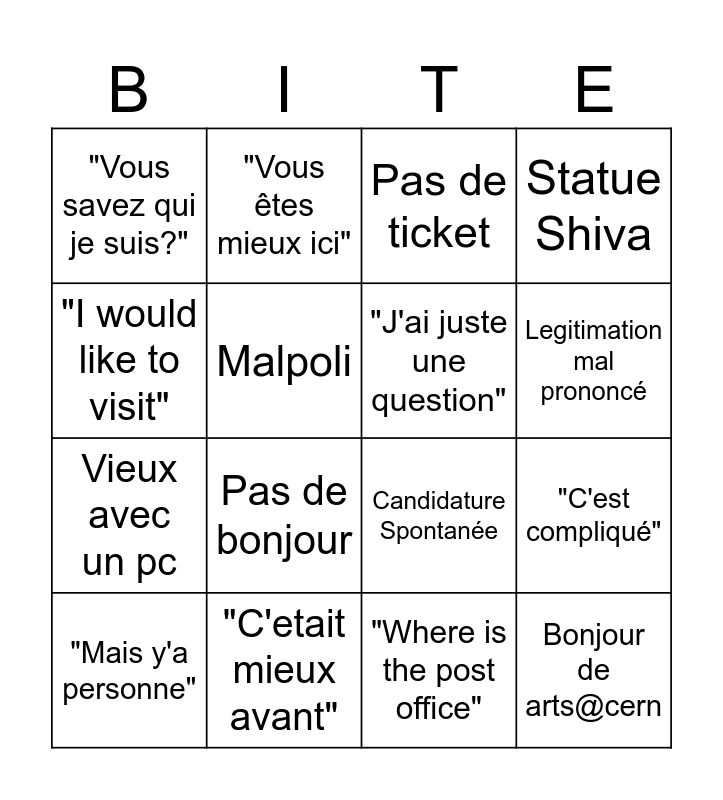 This bingo card has 18 words: Pas de bonjour, Bonjour de arts@cern, Pas de ticket, "Vous savez qui je suis?", Candidature Spontanée, Statue Shiva, "Mais y'a personne", "Vous êtes mieux ici", Legitimation mal prononcé, Vieux avec un pc, "Where is the post office", "I would like to visit", "C'est compliqué", Malpoli, "J'ai juste une question", "Vous pouvez pas le faire ?", "C'etait mieux avant" and "Je suis la depuis XX ans".