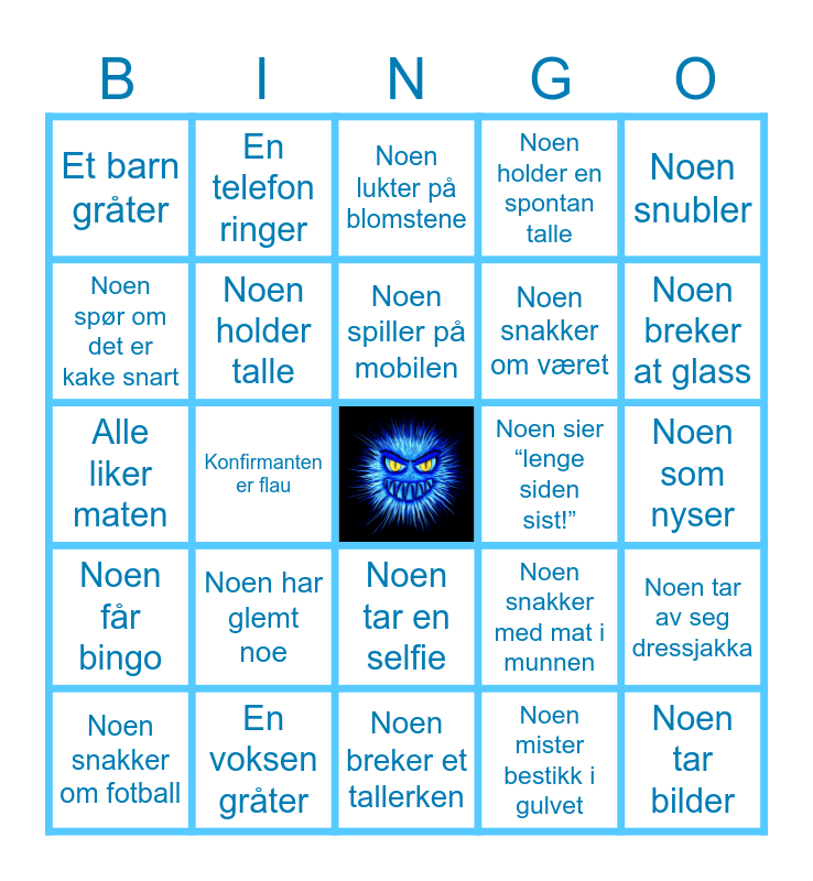 This bingo card has a free space and 33 words: Noen sier “jaa jaa”, Noen som søler, Konfirmanten er flau, Noen ler veldig høyt, Noen får bingo, Noen holder talle, Noen snubler, Noen snakker om fotball, En telefon ringer, Noen sier “du har vokst så mye”, Noen spiller på mobilen, Noen lukter på blomstene, Noen liker ikke maten, Noen er på tiktok, Noen sier “lenge siden sist!”, Noen breker at glass, En voksen gråter, Alle liker maten, Noen har glemt noe, Noen snakker med mat i munnen, Noen tar en selfie, Noen med høye sko, Et barn gråter, Noen som nyser, Noen breker et tallerken, Noen tar bilder, Noen holder en spontan talle, Noen snakker om været, Noen spør om det er kake snart, Noen tar av seg dressjakka, Skål!, Noen mister bestikk i gulvet and Noen snakker om politikk.