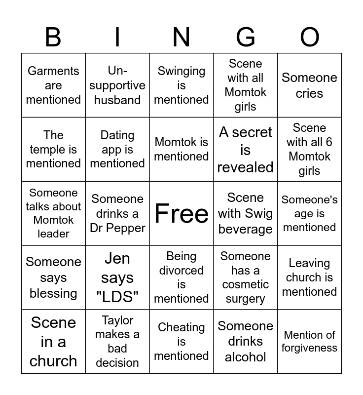 This bingo card has a free space and 24 words: Jen says "LDS", Taylor makes a bad decision, Momtok is mentioned, Scene in a church, Someone cries, Garments are mentioned, The temple is mentioned, Un-supportive husband, Scene with Swig beverage, Being divorced is mentioned, A secret is revealed, Someone talks about Momtok leader, Someone has a cosmetic surgery, Leaving church is mentioned, Dating app is mentioned, Someone drinks alcohol, Someone's age is mentioned, Swinging is mentioned, Scene with all 6 Momtok girls, Someone drinks a Dr Pepper, Mention of forgiveness, Someone says blessing, Scene with all Momtok girls and Cheating is mentioned.