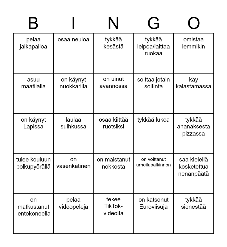 This bingo card has 25 words: on vasenkätinen, tekee TikTok-videoita, on uinut avannossa, on matkustanut lentokoneella, omistaa lemmikin, pelaa jalkapalloa, asuu maatilalla, osaa neuloa, tykkää lukea, on maistanut nokkosta, soittaa jotain soitinta, on käynyt Lapissa, on voittanut urheilupalkinnon, saa kielellä kosketettua nenänpäätä, on käynyt nuokkarilla, tykkää sienestää, tykkää ananaksesta pizzassa, tykkää kesästä, käy kalastamassa, laulaa suihkussa, osaa kiittää ruotsiksi, pelaa videopelejä, tulee kouluun polkupyörällä, tykkää leipoa/laittaa ruokaa and on katsonut Euroviisuja.