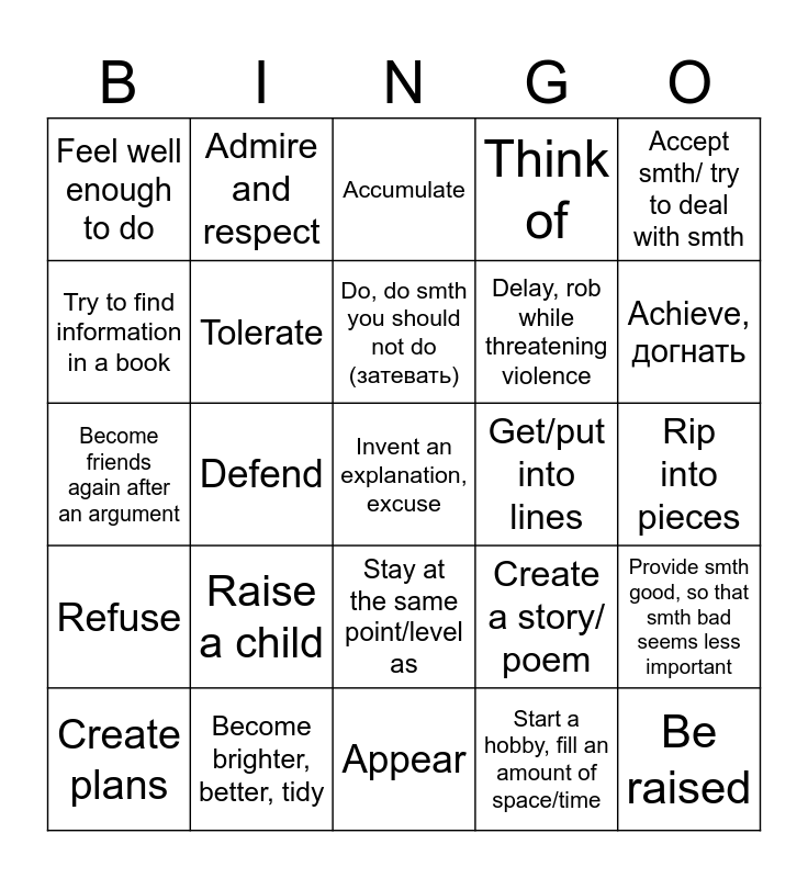 This bingo card has a free space and 24 words: Raise a child, Become brighter, better, tidy, Do, do smth you should not do (затевать), Create plans, Accept smth/ try to deal with smth, Feel well enough to do, Try to find information in a book, Admire and respect, Get/put into lines, Stay at the same point/level as, Delay, rob while threatening violence, Become friends again after an argument, Create a story/ poem, Provide smth good, so that smth bad seems less important, Tolerate, Start a hobby, fill an amount of space/time, Rip into pieces, Accumulate, Achieve, догнать, Defend, Be raised, Refuse, Think of and Appear.