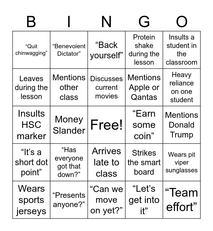 This bingo card has a free space and 35 words: “Band Six Triangle”, “You don’t need this”, “When is our next lesson?”, Mentions other class, Arrives late to class, Protein shake during the lesson, Leaves during the lesson, Threatens to overturn the table, Discusses current movies, Insults a student sample, Insults HSC marker, Insults a student in the classroom, Leaves three times during the lesson, “Last Slide”, “Quit chinwagging”, “Earn some coin”, “Let’s get into it”, Money Slander, “It’s a short dot point”, “Team effort”, Strikes the smart board, Wears sports jerseys, Wears pit viper sunglasses, “Presents anyone?”, “Back yourself”, Heavy reliance on one student, Mentions economics class, Neon coloured shoes, Mentions Apple or Qantas, Mentions Donald Trump, “Where’s [Student]?”, “Can we move on yet?”, “Has everyone got that down?”, “Benevoient Dictator” and Political Chat.