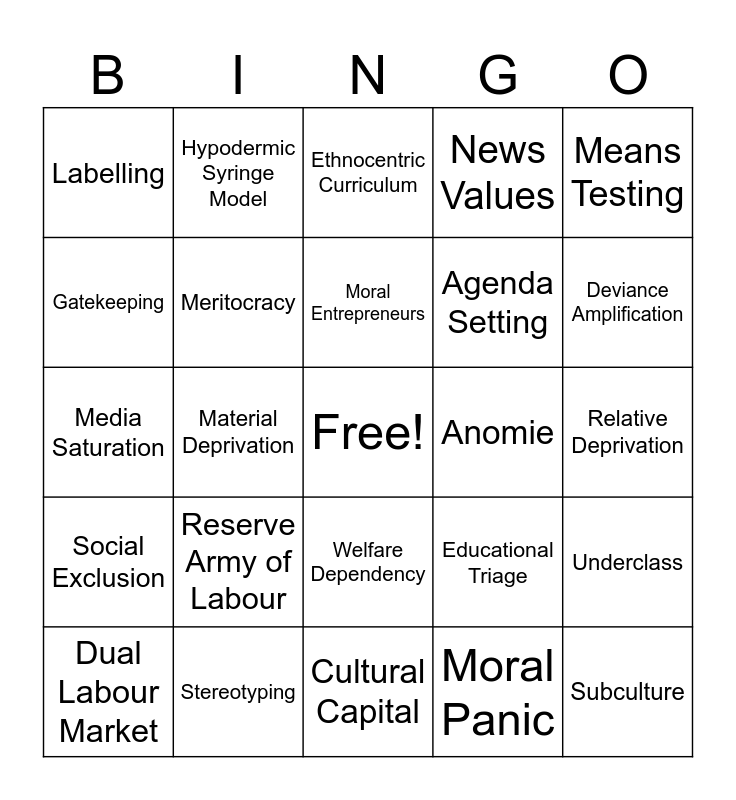 This bingo card has a free space and 31 words: Cultural Capital, Hidden Curriculum, Material Deprivation, Marketisation, Labelling, Ethnocentric Curriculum, Meritocracy, Educational Triage, Anomie, Moral Panic, Relative Deprivation, Subculture, White Collar Crime, Zero Tolerance, Deviance Amplification, Absolute Poverty, Underclass, Reserve Army of Labour, Social Exclusion, Welfare Dependency, Means Testing, Life Chances, Dual Labour Market, Hypodermic Syringe Model, Agenda Setting, Gatekeeping, News Values, Media Saturation, Stereotyping, Moral Entrepreneurs and Churnalism.