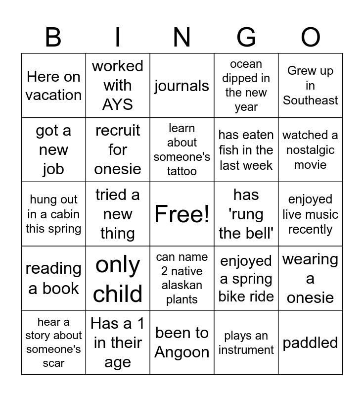 This bingo card has a free space and 24 words: only child, Has a 1 in their age, learn about someone's tattoo, hear a story about someone's scar, Grew up in Southeast, Here on vacation, got a new job, worked with AYS, has 'rung the bell', can name 2 native alaskan plants, has eaten fish in the last week, hung out in a cabin this spring, enjoyed a spring bike ride, wearing a onesie, recruit for onesie, plays an instrument, enjoyed live music recently, journals, watched a nostalgic movie, tried a new thing, paddled, reading a book, ocean dipped in the new year and been to Angoon.