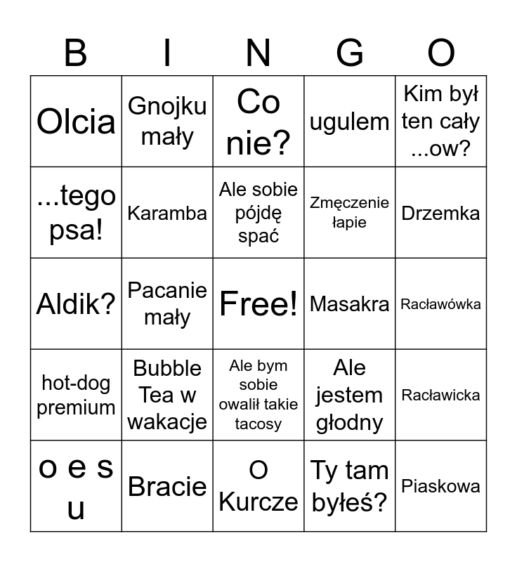 This bingo card has a free space and 24 words: o e s u, Bubble Tea w wakacje, Ale sobie pójdę spać, Ty tam byłeś?, Kim był ten cały ...ow?, Olcia, Gnojku mały, Co nie?, Masakra, Racławówka, Aldik?, Karamba, Ale jestem głodny, Racławicka, ...tego psa!, Bracie, O Kurcze, ugulem, Drzemka, hot-dog premium, Pacanie mały, Ale bym sobie owalił takie tacosy, Zmęczenie łapie and Piaskowa.