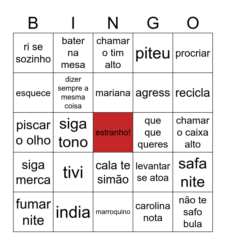 This bingo card has a free space and 24 words: tivi, india, mariana, fumar nite, procriar, ri se sozinho, esquece, bater na mesa, que que queres, cala te simão, agress, piscar o olho, levantar se atoa, safa nite, dizer sempre a mesma coisa, carolina nota, chamar o caixa alto, chamar o tim alto, recicla, siga tono, não te safo bula, siga merca, piteu and marroquino.