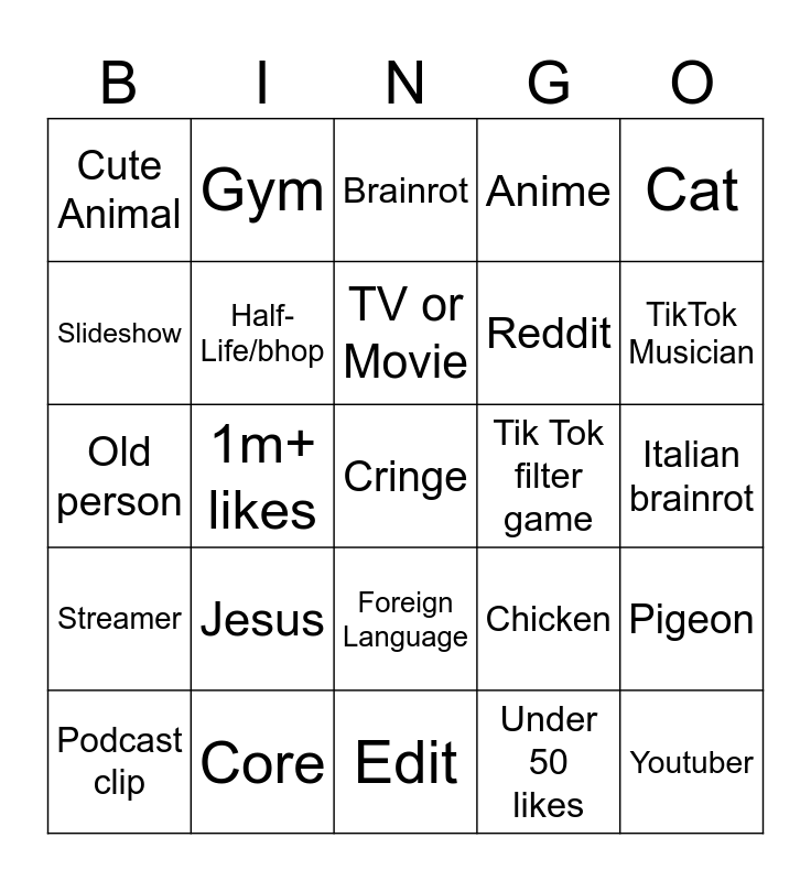 This bingo card has a free space and 24 words: Jesus, Core, TV or Movie, Podcast clip, Cat, Cute Animal, Slideshow, Gym, Tik Tok filter game, Foreign Language, Reddit, Old person, Chicken, Pigeon, Half-Life/bhop, Under 50 likes, Italian brainrot, Brainrot, TikTok Musician, 1m+ likes, Youtuber, Streamer, Anime and Edit.