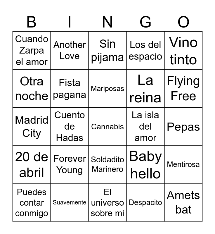 This bingo card has 98 words: NUEVAYol, Mon Amour, Ojitos Lindos, Pepas, Flamenco y Bachata, Ateo, Despecha, Quevedo-BZRP session, Volando voy, Tu calorro, Bamboléo, Mamma mía, Ay Mamma, Forever Young, Verde, Another Love, Madrid City, Me voy de Fiesta, Será perche ti amo, Rayos de SOL, Miénteme, Fiebre, Hips Don´t Lie, Waka Waka, Dime, Cuando Zarpa el amor, El universo sobre mi, Ave María, La canción del Velero, Dos hombre y un destino, Puedes contar conmigo, Otra noche, You´re de one that I want, Gasolina, Flying Free, Amets bat, Los del espacio, Mercho, Cuento de Hadas, Nochentera, Caminando por la vida, Mariposas, La reina, Madre tierra, Potra salvaje, Soldadito Marinero, Tenía tanto que darte, Marta, Sebas, Guille y los demás, La llama del amor, Yo quiero Bailar, Buscate un hombre que te quiera, Me has invitado a bailar, Todos los días sale el sol, Pa´Madrid, Tanto la queria, 20 de Enero, 20 de abril, Que te queía, Escuchame mujer, Pasado pisado, La morocha, Gran vía, Torero, Esta soy yo, La lluvía, Si Antes Te Hubiera Conocido, Vida de Rico, La Bachata, Shallow Euphoria, A un paso de la luna, Sin pijama, Tusa, Despacito, La vida sin ti, Ohnana, Soltera, Carita Triste, Fisica o quimica, No dudaría, Cannabis, Mari Carme, Fista pagana, Suavemente, Purpurina, La rubia, Contando lunares, Bella ciao, Que te den, Mentirosa, Blackout, Esa Diva, Baby hello, Todo de ti, PIToRRO DE COCO, La isla del amor, La historia, Vino tinto and Zapatillas.
