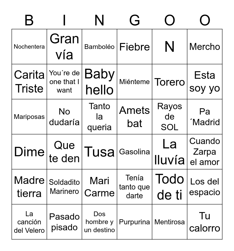 This bingo card has 104 words: B, I, N, G, O, !, NUEVAYol, Mon Amour, Ojitos Lindos, Pepas, Flamenco y Bachata, Ateo, Despecha, Quevedo-BZRP session, Volando voy, Tu calorro, Bamboléo, Mamma mía, Ay Mamma, Forever Young, Verde, Another Love, Madrid City, Me voy de Fiesta, Será perche ti amo, Rayos de SOL, Miénteme, Fiebre, Hips Don´t Lie, Waka Waka, Dime, Cuando Zarpa el amor, El universo sobre mi, Ave María, La canción del Velero, Dos hombre y un destino, Puedes contar conmigo, Otra noche, You´re de one that I want, Gasolina, Flying Free, Amets bat, Los del espacio, Mercho, Cuento de Hadas, Nochentera, Caminando por la vida, Mariposas, La reina, Madre tierra, Potra salvaje, Soldadito Marinero, Tenía tanto que darte, Marta, Sebas, Guille y los demás, La llama del amor, Yo quiero Bailar, Buscate un hombre que te quiera, Me has invitado a bailar, Todos los días sale el sol, Pa´Madrid, Tanto la queria, 20 de Enero, 20 de abril, Que te queía, Escuchame mujer, Pasado pisado, La morocha, Gran vía, Torero, Esta soy yo, La lluvía, Si Antes Te Hubiera Conocido, Vida de Rico, La Bachata, Shallow Euphoria, A un paso de la luna, Sin pijama, Tusa, Despacito, La vida sin ti, Ohnana, Soltera, Carita Triste, Fisica o quimica, No dudaría, Cannabis, Mari Carme, Fista pagana, Suavemente, Purpurina, La rubia, Contando lunares, Bella ciao, Que te den, Mentirosa, Blackout, Esa Diva, Baby hello, Todo de ti, PIToRRO DE COCO, La isla del amor, La historia, Vino tinto and Zapatillas.