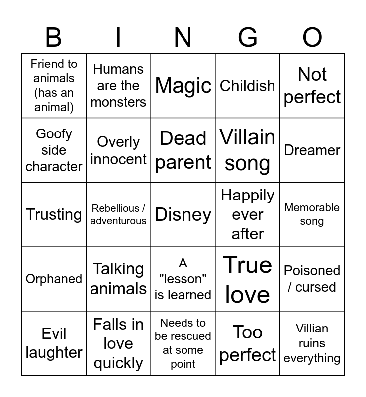 This bingo card has a free space and 28 words: Aren't satisfied with life, Falls in love quickly, Dead parent, Too perfect, Not perfect, Friend to animals (has an animal), Overly innocent, Needs to be rescued at some point, Happily ever after, Poisoned / cursed, Trusting, Rebellious / adventurous, True love, Villian ruins everything, Goofy side character, Everyone comes together to help princess, A "lesson" is learned, Childish, Dreamer, Evil laughter, Humans are the monsters, An "i want" song, Villain song, Memorable song, Orphaned, Talking animals, Magic and Ugly bad person.