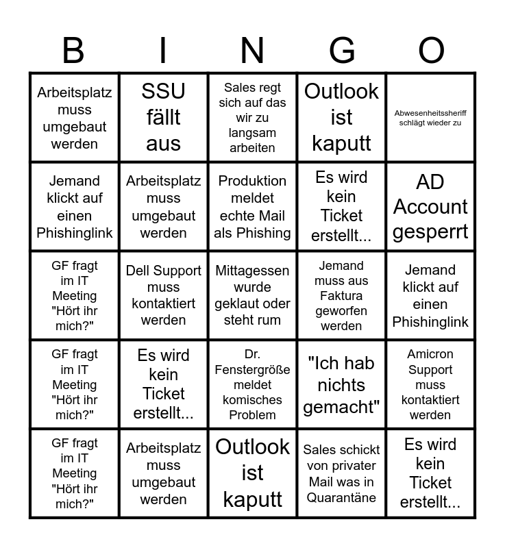 This bingo card has 76 words: Free!, Dr. Fenstergröße meldet komisches Problem, Sales regt sich auf das wir zu langsam arbeiten, GF kann sich nicht dran erinnern, Berater erzählt aus seinem Privatleben, Jemand sperrt seinen Rechner nicht, Jemand verlässt die Firma, Ladesäule geht kaputt, "Ich hab nichts gemacht", AD Account gesperrt, Es wird kein Ticket erstellt..., Lampe defekt - IT muss Hausmeister spielen, Produktion meldet echte Mail als Phishing, Jemand klickt auf einen Phishinglink, Sales schickt von privater Mail was in Quarantäne, Dell Support muss kontaktiert werden, Jemand muss aus Faktura geworfen werden, Mittagessen wurde geklaut oder steht rum, Abwenseheitsmeldung eintragen weil Urlaub, Abwesenheitssheriff schlägt wieder zu, Amicron Support muss kontaktiert werden, GF fragt im IT Meeting "Hört ihr mich?", Arbeitsplatz muss umgebaut werden, SSU fällt aus, Outlook ist kaputt, Jemand braucht das Backup zur Wiederherstellung, Dr. Fenstergröße meldet komisches Problem, Sales regt sich auf das wir zu langsam arbeiten, GF kann sich nicht dran erinnern, Berater erzählt aus seinem Privatleben, Jemand sperrt seinen Rechner nicht, Jemand verlässt die Firma, Ladesäule geht kaputt, "Ich hab nichts gemacht", AD Account gesperrt, Es wird kein Ticket erstellt..., Lampe defekt - IT muss Hausmeister spielen, Produktion meldet echte Mail als Phishing, Jemand klickt auf einen Phishinglink, Sales schickt von privater Mail was in Quarantäne, Dell Support muss kontaktiert werden, Jemand muss aus Faktura geworfen werden, Mittagessen wurde geklaut oder steht rum, Abwenseheitsmeldung eintragen weil Urlaub, Abwesenheitssheriff schlägt wieder zu, Amicron Support muss kontaktiert werden, GF fragt im IT Meeting "Hört ihr mich?", Arbeitsplatz muss umgebaut werden, SSU fällt aus, Outlook ist kaputt, Jemand braucht das Backup zur Wiederherstellung, Dr. Fenstergröße meldet komisches Problem, Sales regt sich auf das wir zu langsam arbeiten, GF kann sich nicht dran erinnern, Berater erzählt aus seinem Privatleben, Jemand sperrt seinen Rechner nicht, Jemand verlässt die Firma, Ladesäule geht kaputt, "Ich hab nichts gemacht", AD Account gesperrt, Es wird kein Ticket erstellt..., Lampe defekt - IT muss Hausmeister spielen, Produktion meldet echte Mail als Phishing, Jemand klickt auf einen Phishinglink, Sales schickt von privater Mail was in Quarantäne, Dell Support muss kontaktiert werden, Jemand muss aus Faktura geworfen werden, Mittagessen wurde geklaut oder steht rum, Abwenseheitsmeldung eintragen weil Urlaub, Abwesenheitssheriff schlägt wieder zu, Amicron Support muss kontaktiert werden, GF fragt im IT Meeting "Hört ihr mich?", Arbeitsplatz muss umgebaut werden, SSU fällt aus, Outlook ist kaputt and Jemand braucht das Backup zur Wiederherstellung.