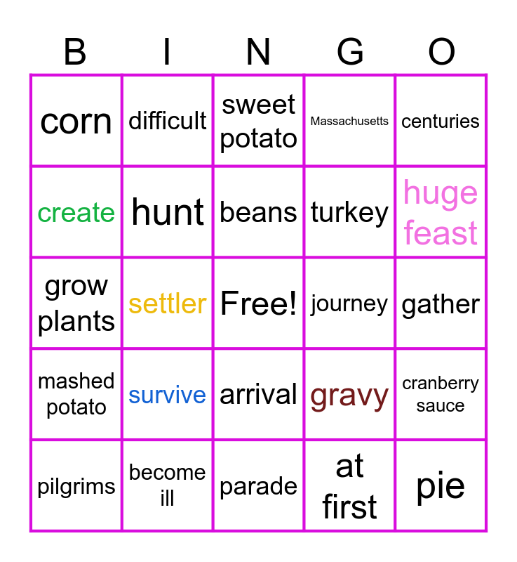 This bingo card has a free space and 26 words: arrival, at first, beans, become ill, centuries, corn, create, difficult, gather, gravy, turkey, grow plants, cranberry sauce, pilgrims, settler, Mayflower, Massachusetts, mashed potato, sweet potato, pie, huge feast, parade, journey, survive, hunt and half of.