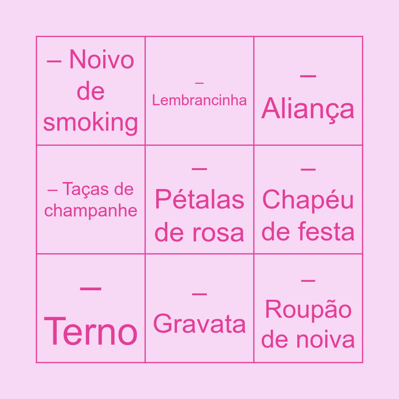 This bingo card has 17 words: Véu, – Buquê, – Aliança, – Noivo de smoking, – Bolo de casamento, – Taças de champanhe, – Pombinhos, – Terno, – Gravata, – Chapéu de festa, – Bem-casado, – Coroa de flores, – Pétalas de rosa, – Lembrancinha, – Roupão de noiva, – Confete and – Madrinhas de vestido.