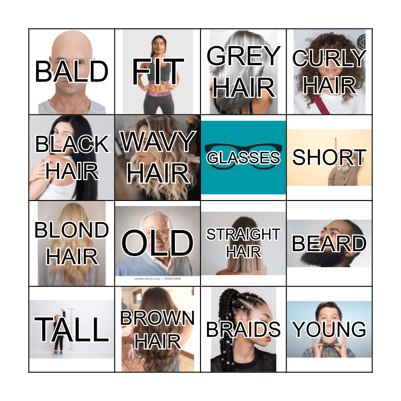 This bingo card has 16 images and 16 words: BROWN HAIR, BEARD, GREY HAIR, BALD, BLOND HAIR, FIT, STRAIGHT HAIR, BRAIDS, BLACK HAIR, WAVY HAIR, TALL, CURLY HAIR, OLD, SHORT, GLASSES and YOUNG.